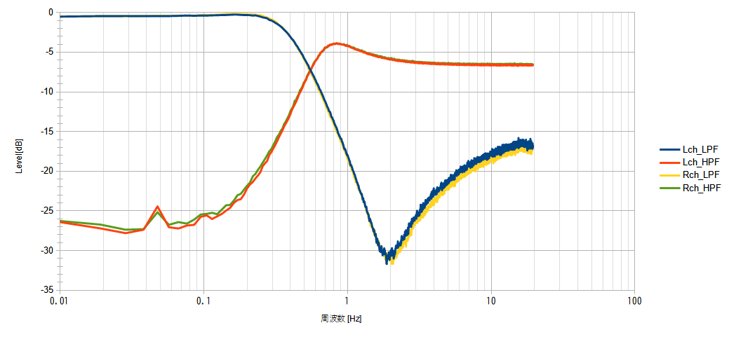 全体としては、まずまず設計通り。HPFの100Hz以下は、ノイズフロアにぶつかっているのとハムの影響あり。